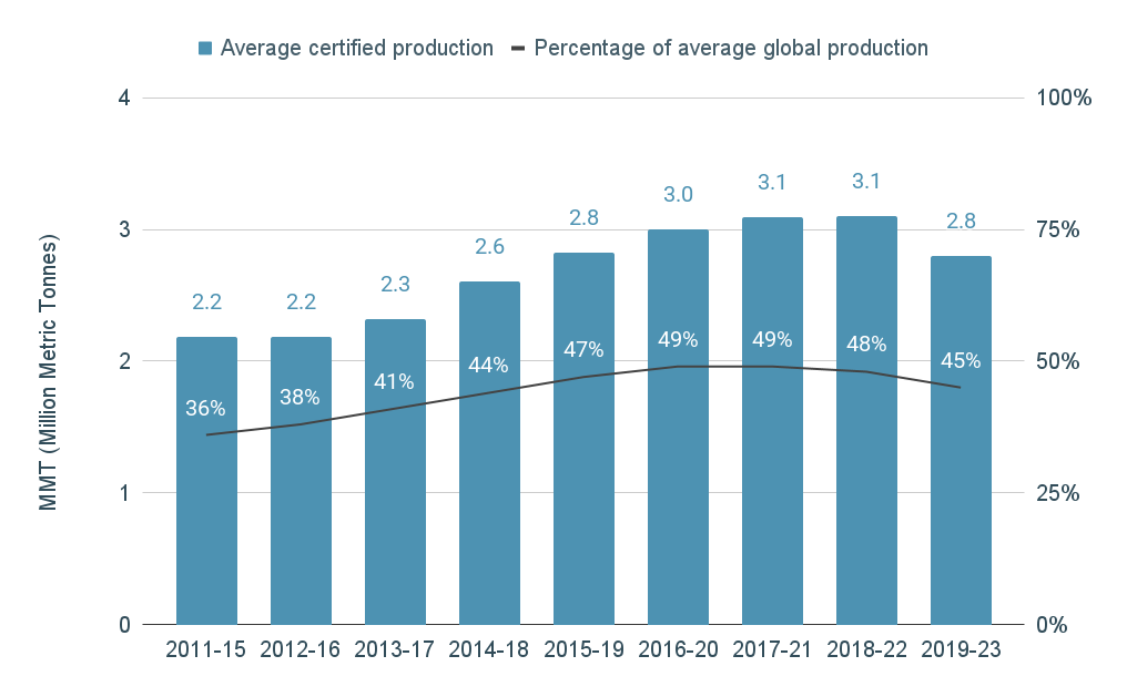 As shown in the chart below, MarinTrust certified production has demonstrated a stable and sustained contribution to the global marine ingredients market over time. The chart presents rolling five-year averages – from 2012–2017 through to 2020–2024 – which illustrate that certified production has consistently accounted for a significant share of global fishmeal and fish oil output. Most recently, an average of 44% of global production from 2020 to 2024 was MarinTrust certified.